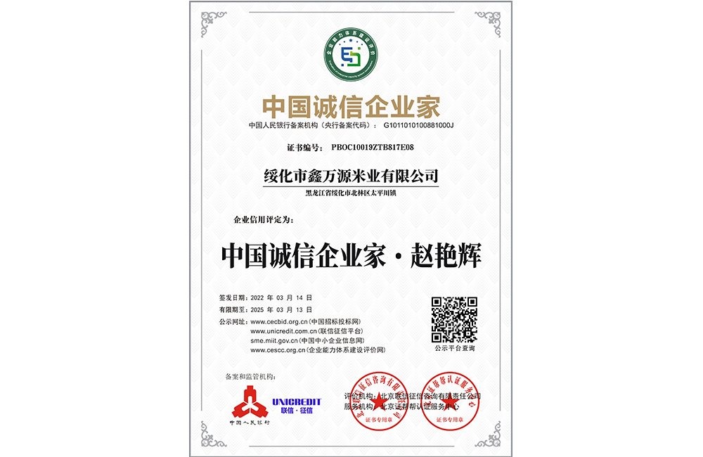走進我們 ABOUT US 您現(xiàn)在的位置:網(wǎng)站首頁 > 走進我們 > 資質(zhì)榮譽 公司簡介 COMPANY PROFILE 領導致辭 CORPORATE CULTURE 資質(zhì)榮譽 HONORS 企業(yè)文化 HONORS 中國誠信企業(yè)家:趙艷輝 黑龍江省示范糧油示范加工企業(yè) 鑫萬源米業(yè)兩化融合管理體系評定證書 綏化市大學生實習實訓基地 農(nóng)業(yè)產(chǎn)業(yè)化市級重點龍頭企業(yè) “鄉(xiāng)村振興,扶危助困”活動榮譽證書 共35條記錄 當前為第6頁/共6頁上一頁123456下一頁
